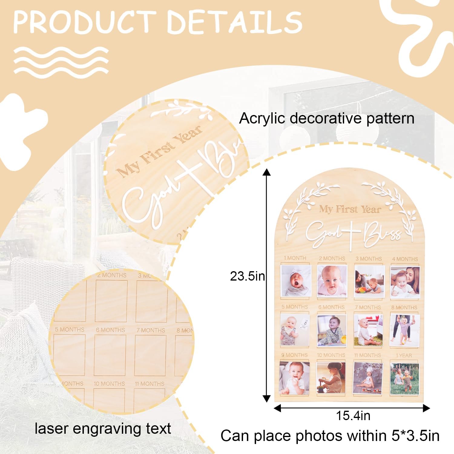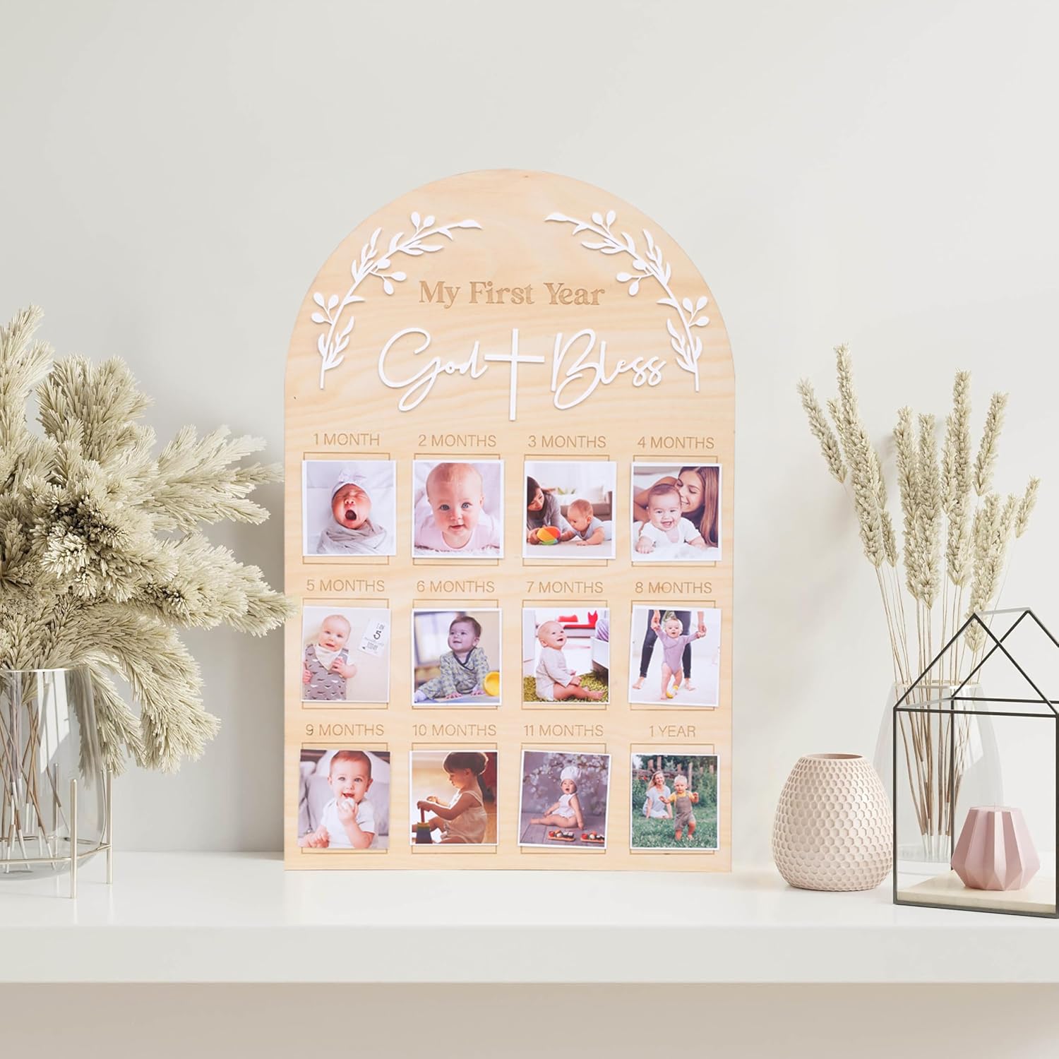 - GOD BLESS WOODEN PHOTO BOARD: With this stylish first year monthly photo display board, we can see your baby's adorable appearance at different stages and add more warmth and joy to your celebration