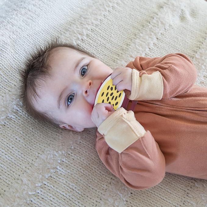 - Comforting Silicone Teethers: These passionfruit and lime-shaped teethers are designed to soothe teething discomfort with soft, BPA-free silicone that’s safe for your baby’s gums