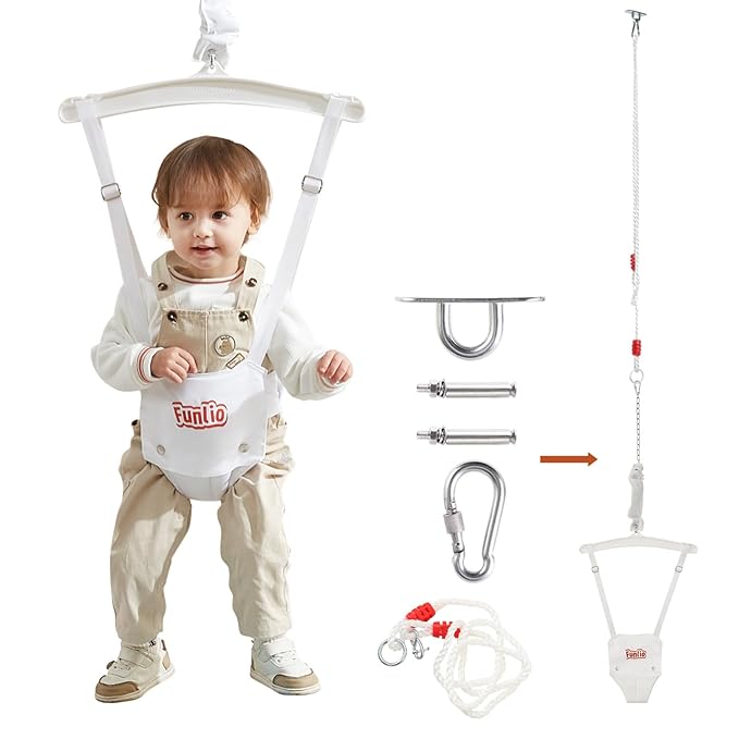 - 【Have a happy childhood】Get ready for endless hours of fun! FUNLIO baby jumper comes with a height-adjustable chain, suitable for toddlers aged 6-24 months. The length of the chain is adjustable to 10in, and your baby can play indoors or outdoors. This set will help infants improve balance and exercise muscles, let your little one enjoy a happy childhood.
