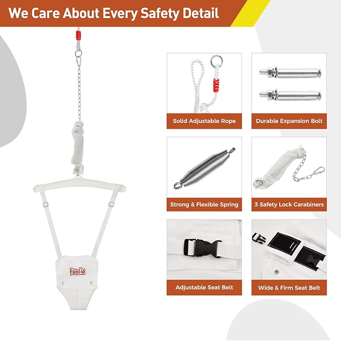 - 【What You Will Get】Package includes: 1*FUNLIO baby jumper, 1*stainless steel ceiling hook, 2*expansion bolts, 1*safety extension rope. The ceiling hook is made of high-quality stainless steel, strong and durable. The expansion bolts are sturdy and easy to set. The safety extension rope is adjustable (29.5in - 61in), so you can easily adjust it to an ideal length. Everything you need is prepared in this convenient set.