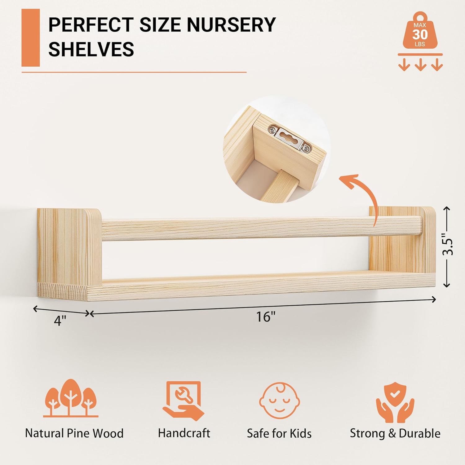 Heimlove Nursery Floating Shelves, Wood Nursery Book Shelves for Wall, 16 inch Wall Bookshelf for Kids Solid Wood Wall Mounted Shelves for Books,Toys and Decor Storage, Set of 2