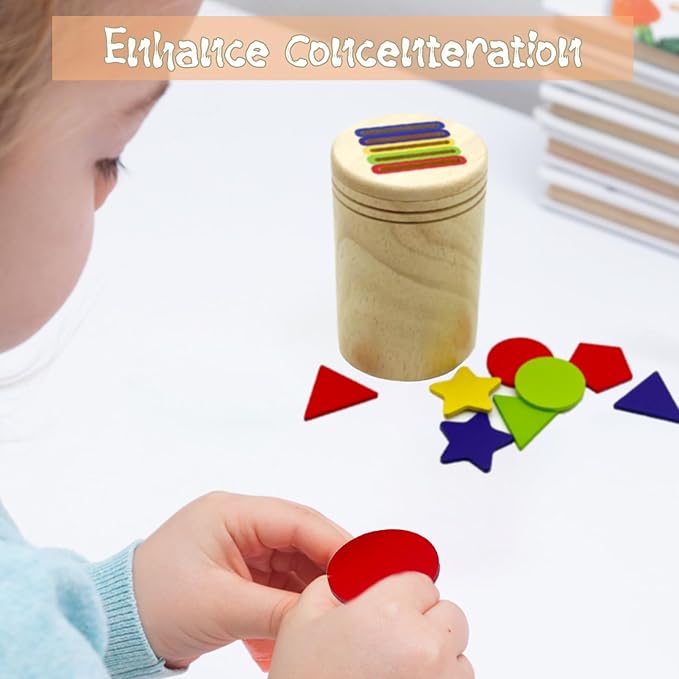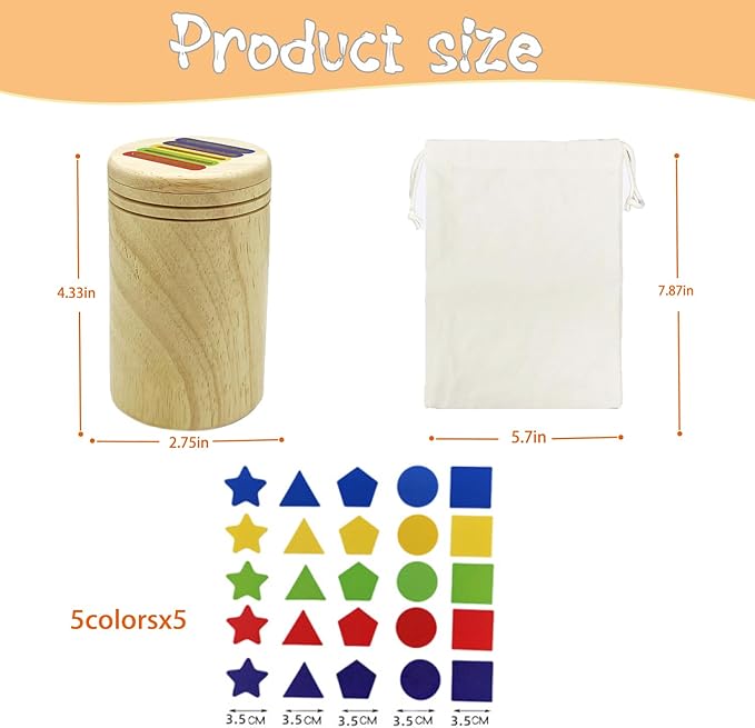 - Montessori Sticks for Kids - Our wooden sorting toy includes 25 wooden chips in 5 colors & 5 shapes and a cylinder storage box. The appropriate length can effectively prevent the risk of suffocation for babies. Children inert the colored sticks into the corresponding color slots, and the abundant color matching game will keep the baby busy