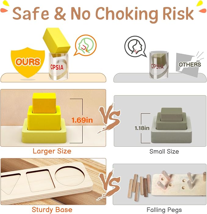 - Versatile Play Options: In addition to traditional stacking, these Montessori stacking toys can also be used as dominoes, adding extra fun and variety to playtime. This multi-functional design keeps children engaged while promoting both physical and cognitive development. They are the perfect montessori toys for 1 2 3 year old toddlers.