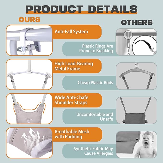 - INDOOR & OUTDOOR: Our 2-in-1 baby jumpers and bouncers can be used indoors and outdoors, liberating parents' hands, alleviating parenting anxiety, allowing you to get a respite from busy housework and work, and enjoying warm parent-child time.