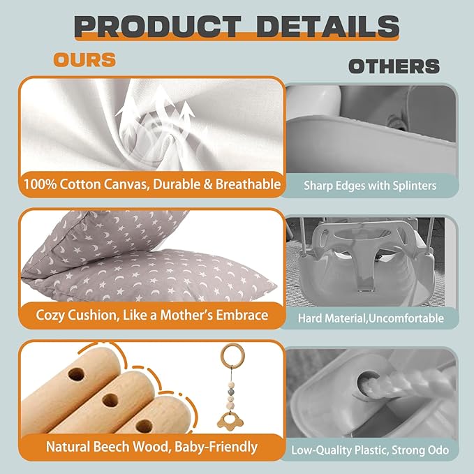 - BABY SWING: Cotton canvas, comfortable pillows and cushions, polished natural beech, strong rope, and adjustable seat belt to keep your baby safe at all times.