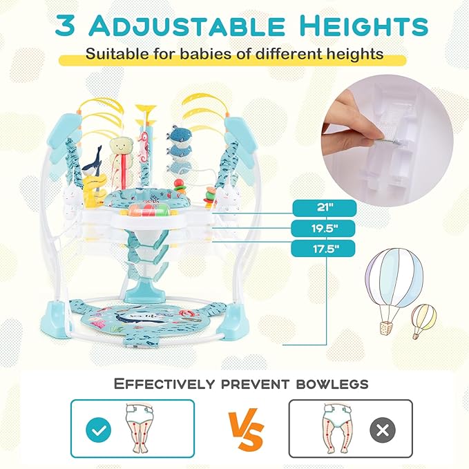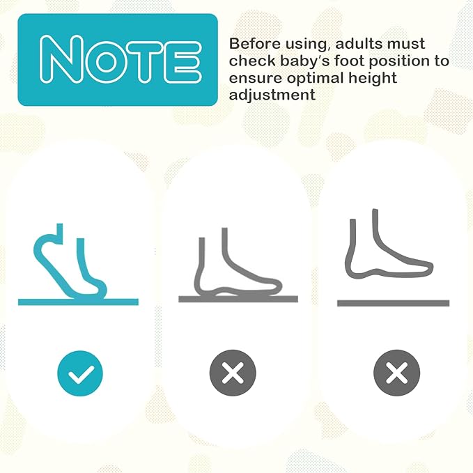 - 3 Adjustable Heights: This baby bouncer can be adjusted to 45 cm, 49.5 cm or 53 cm (height from the table to the floor), suitable for babies of different heights. Note: before using, adults must check baby’s foot position to ensure optimal height adjustment. Height limit: 30". Suitable age: 6+ months.