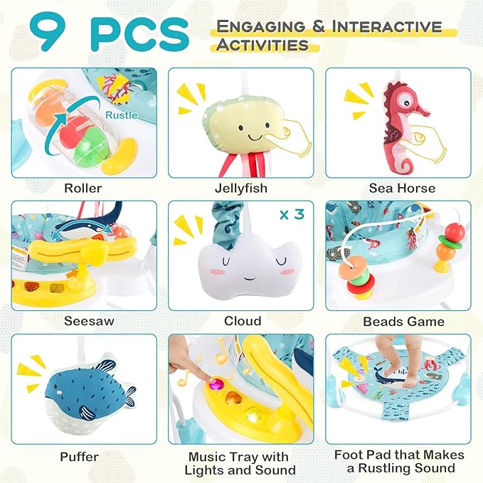 - Interactive Toys & Music Box: This baby jumper comes with 10 pcs engaging and interactive activities: a roller, an owl, a bear, a seesaw, 3 cloud-shaped toys, a beads game, a hedgehog, a music tray with lights and sound effect, a foot pad that makes a rustling sound. These toys can stimulate your baby's senses and promote cognitive development. Note: music tray requires 3 AAA batteries (not included).