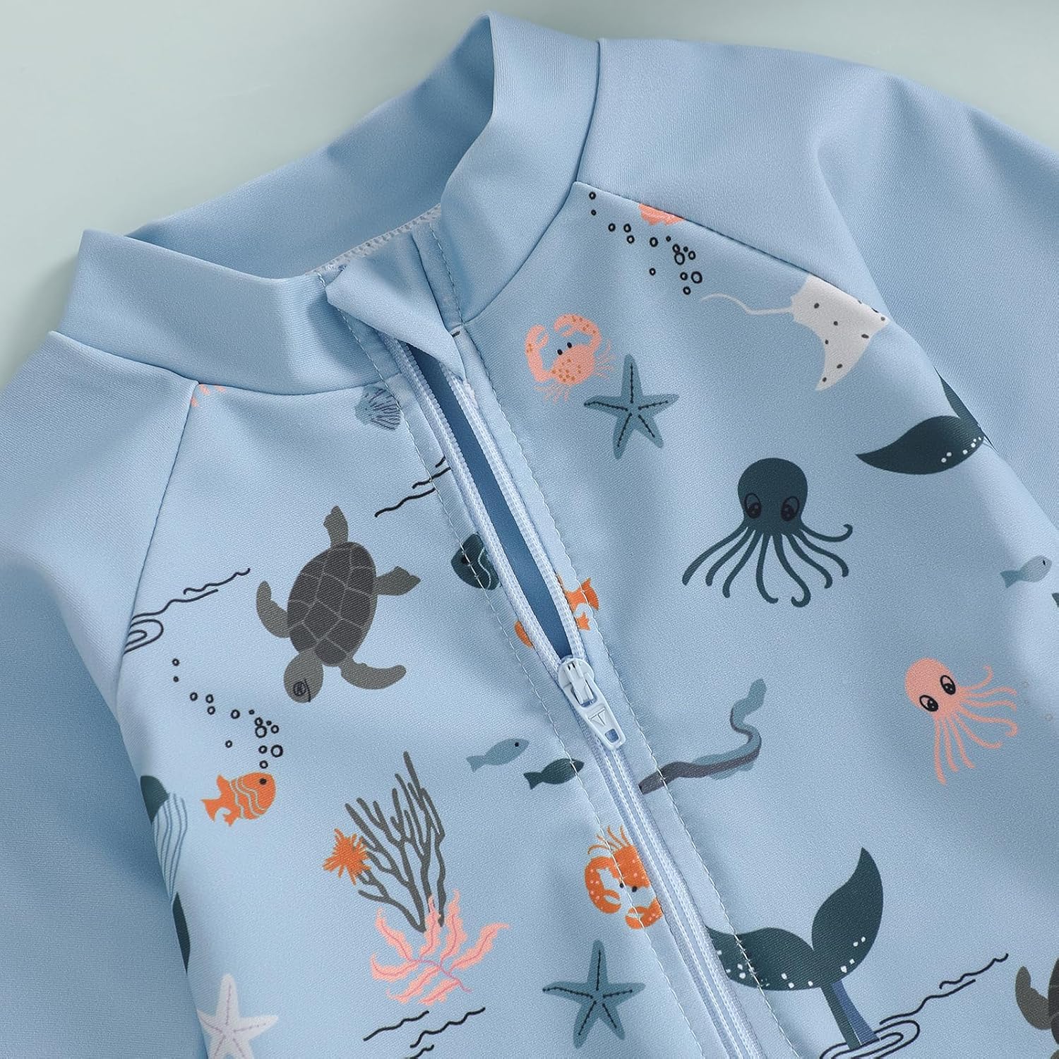 - Design: Toddler bathing suit boy, infant long sleeve swimsuit boy, round neck, back/front zipper closure for easy on and off, newborn swimsuit boy, dinosaur/marine animal print, super cute and lovely, your little boy will stand out in the crowd