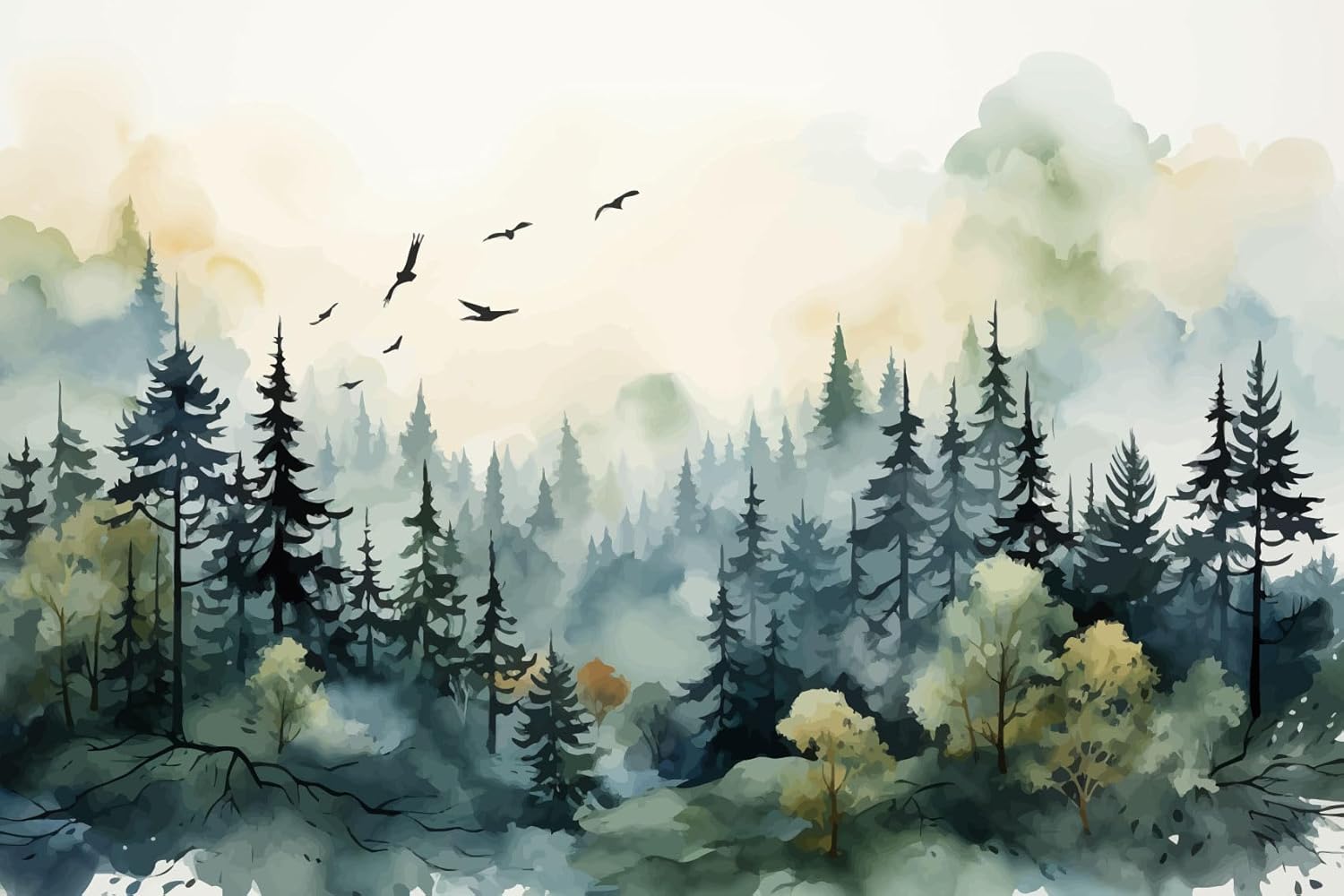 Green Watercolor Forest Wallpaper Woodland Nature Landscape Wall Mural for Living Room Bedroom Dining Room Office(Not Self-Adhesive)