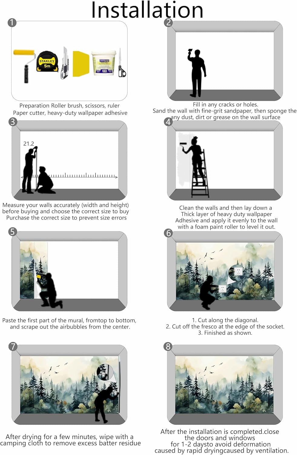 - Installation Steps1. Fill in any cracks or holes and clean the surface of the wall of dust, dirt and grease.2. Apply heavy-duty wallpaper paste to the wall, not the mural.3. Mark the position of each strip of wallpaper with a spirit level.4. Align the pattern and slide it into place.5. Scrape the bubbles with a spatula.6. Let it dry for a couple of minutes and it's ready to go!
