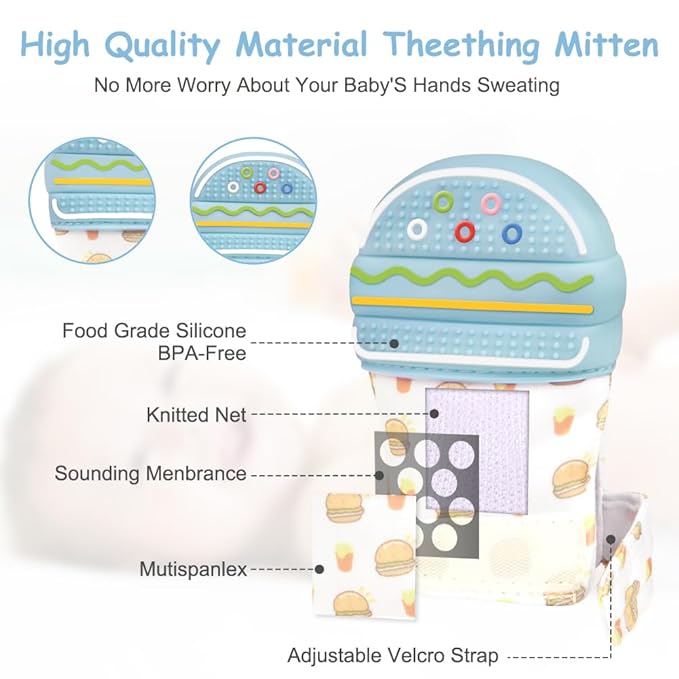 - 【Early Baby Development】The teething mittens have cute creative shapes designed with hamburgers/calves/bunnies, which not only help babies recognize colors and sensory development, but also improve their cognitive coordination