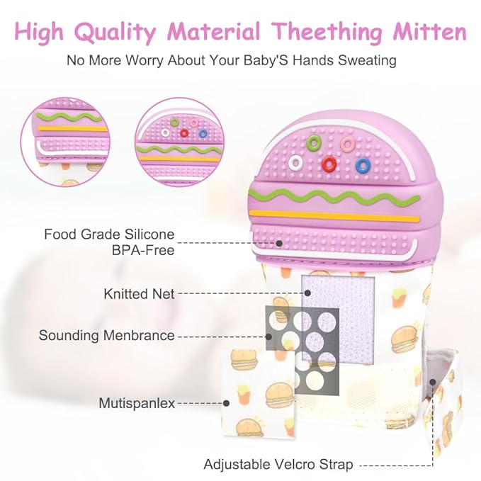 2Pack Silicone Teething Mitt, Hamburger Baby Teething Toy for 0-6 6-12 Months, Food Grade Silicone Infant Teething Mitten, BPA-Free Baby Chew Toys for Pain Relief, Sucking Needs