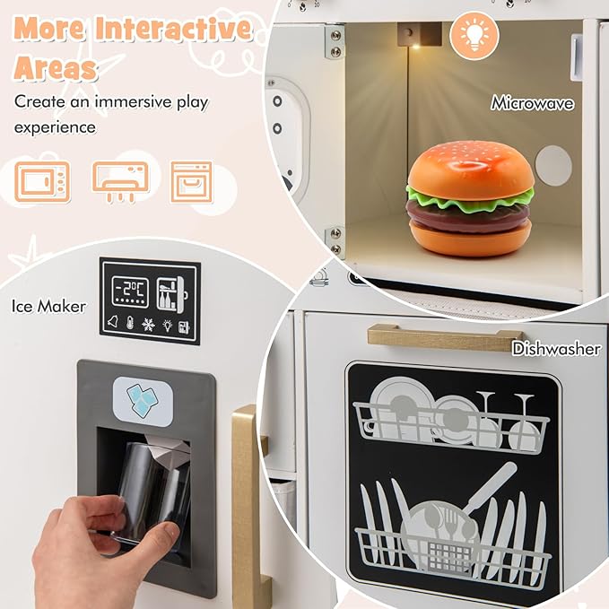- Realistic Cooking Experience: This play kitchen offers realistic elements like a sink with a faucet for washing vegetables and knob-turning features to ignite the stoves, fostering an immersive kitchen experience where your child can cook like a real chef. Little chefs can also enjoy more interactive fun with a light-up microwave, functional ice maker and dishwasher.