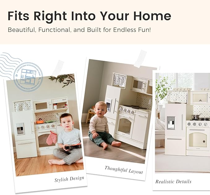 - All-in-One Functional Areas: Includes a stovetop, sink, microwave, oven, pretend ice dispenser, coffee station, and open shelving. Encourages imaginative play while helping kids understand everyday kitchen routines.