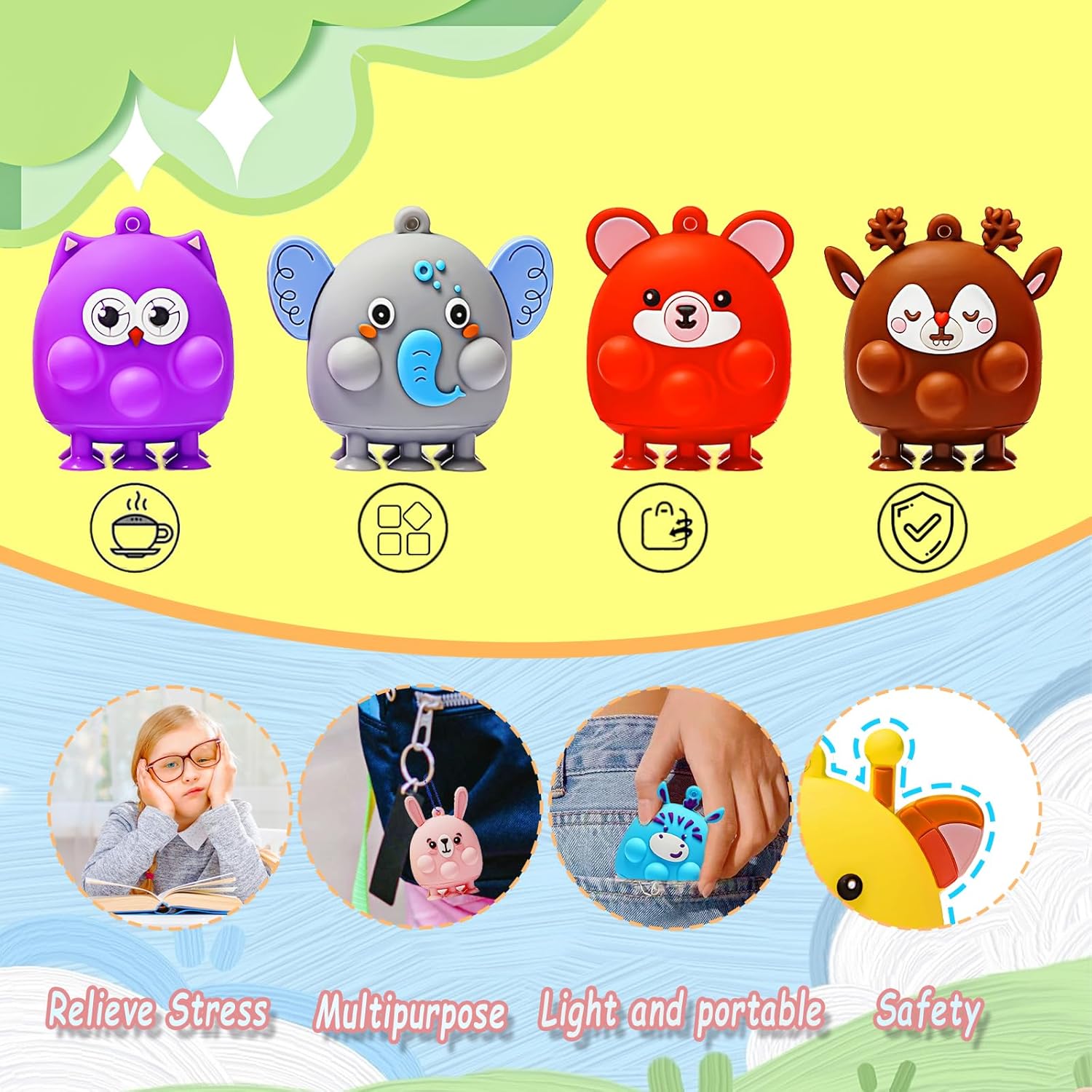 - KIDS FIDGET SUCTION TOYS: This package has some cute elephant *6, rabbit *6, penguin *6, bear *6, owl *6, giraffe *6, zebra *6, elk *6, a total of 48 well-designed styles. Squeeze the bubbles to make a "POP" sound! The bottom suction cup can be firmly attached to the glass and other places. The combination of fidget bubble toy and suction cup toy will help you unlock more new ways to play!