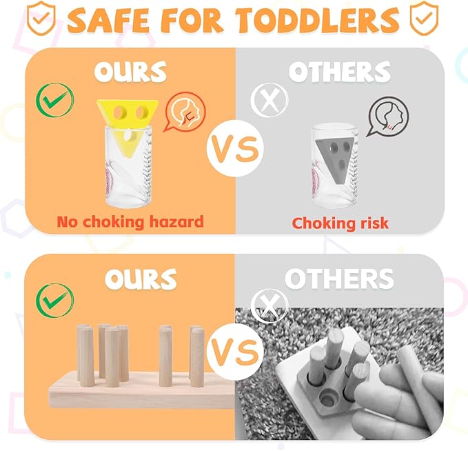 - Montessori Toys for 1 Year Old: This preschool learning toy includes 15 natural wooden blocks in 5 vibrant colors and geometric shapes. The shape sorter for toddlers 1β3 helps develop early color and shape recognition through fun toddler sorting activities. The blocks feature smooth surfaces, rounded edges, and just-right sizes for little hands, while the sturdy pegs ensure safe, frustration-free play