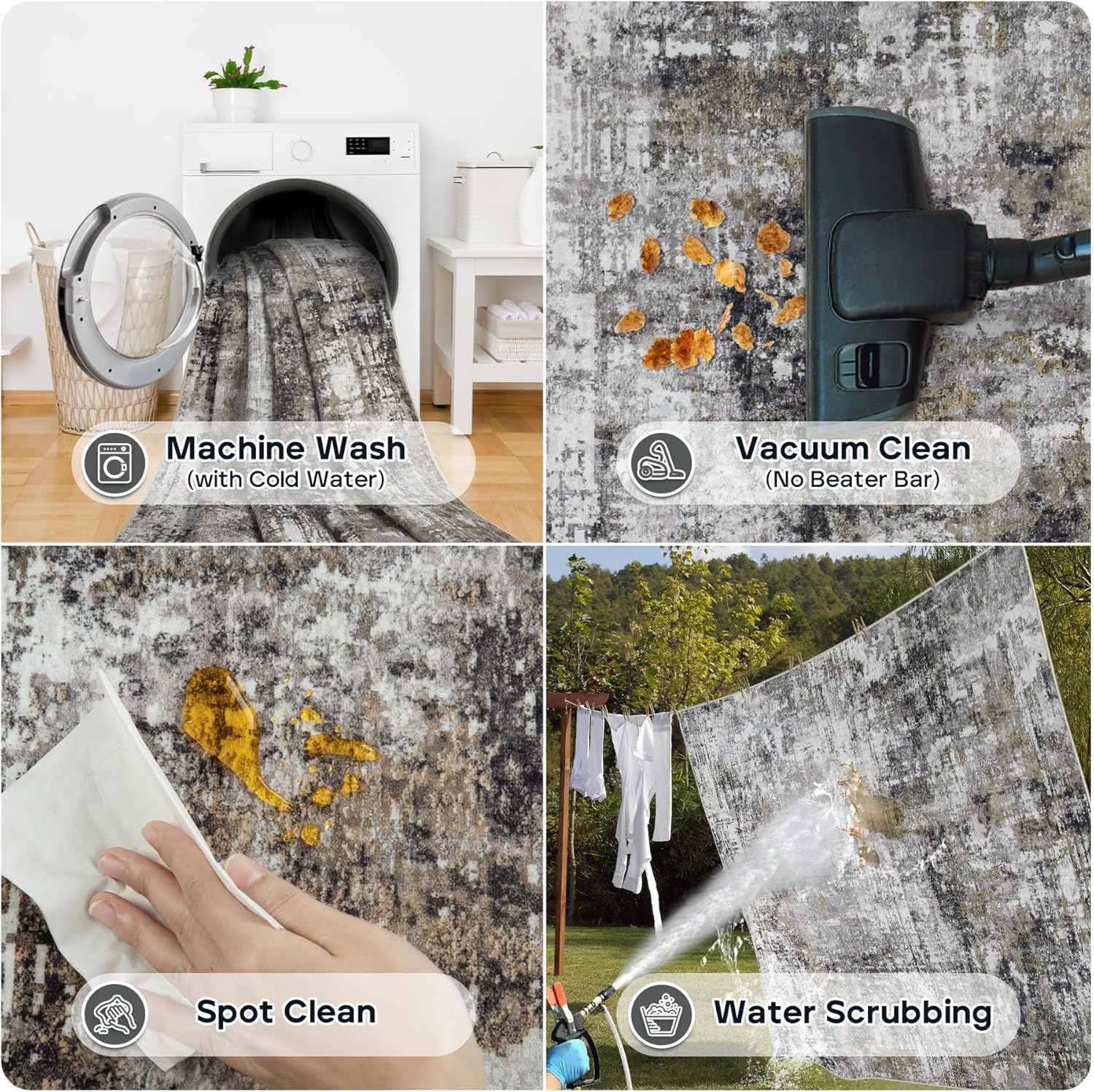 - Easy Maintenance: Keep your space fresh and clean with minimal effort. Our modern 4x6 area rugs are machine washable, spot-cleanable, and vacuum-friendly, making maintenance a breeze. Use a low-power vacuum regularly to remove dust or pet hair for everyday care. Avoid using bleach for best results