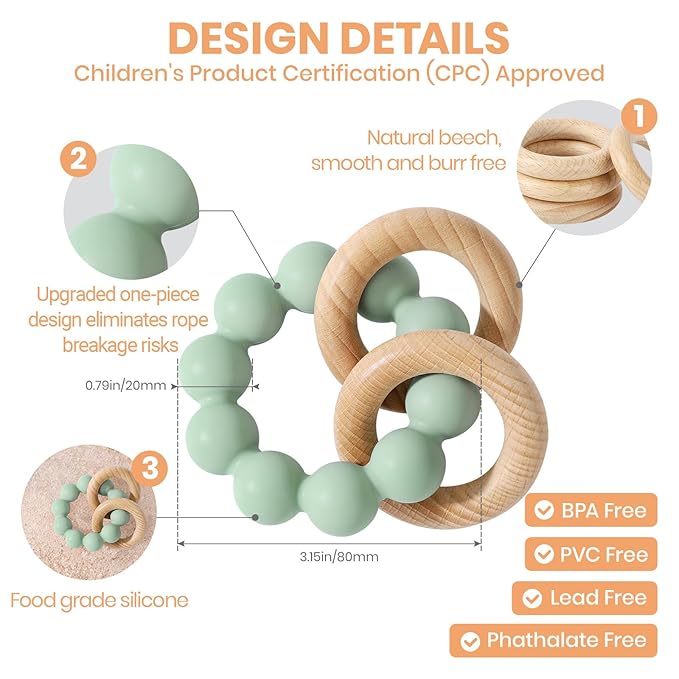 - 【Natural & Non-Toxic】Made from soft, durable, non-toxic, food grade silicone and 2 natural beech wood rings. Perfect baby chew toys that are safe for chewing and gentle on gums.
