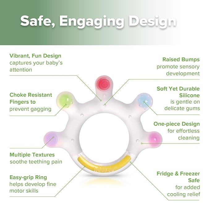 - Great for Teething: Raised ridges and different textures on each fingertips of the Dinky Digits teether help massage your baby's teeth and gums and keep baby interested in sucking and chewing, let your little ones enjoy the teething toys as well soothe the teething discomfort. You can also freeze the teether to provide added cooling relief