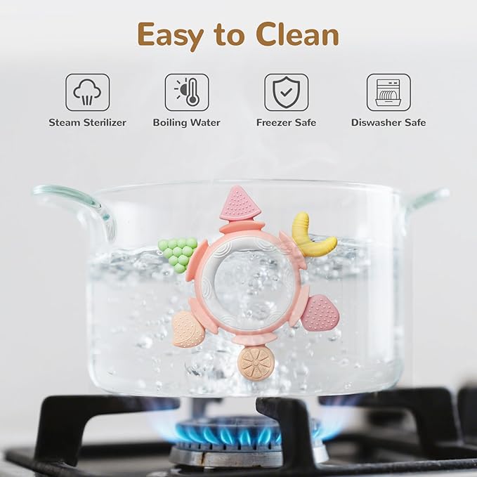 - 【Scientific Design For Babies】 The Silicone Baby Teether Toys are designed with the shap of fruits, which can satisfy the baby's curiosity; Toddler Teether Toy have different protruding textures and bumpy massage particles, which can massage the baby’s gums and easy grasp by babies; Baby Teethers colors are bright, which can improve the baby's color recognition.