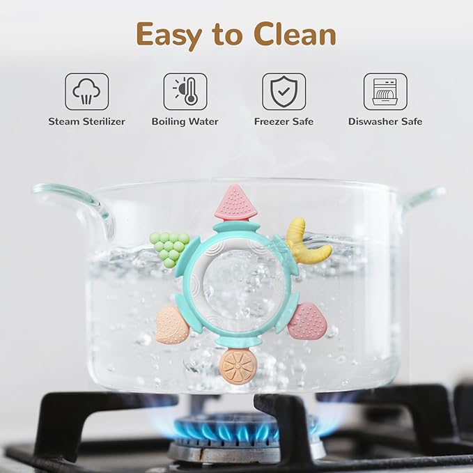 - 【Scientific Design For Babies】 The Silicone Baby Teether Toys are designed with the shap of fruits, which can satisfy the baby's curiosity; Toddler Teether Toy have different protruding textures and bumpy massage particles, which can massage the baby’s gums and easy grasp by babies; Baby Teethers colors are bright, which can improve the baby's color recognition.