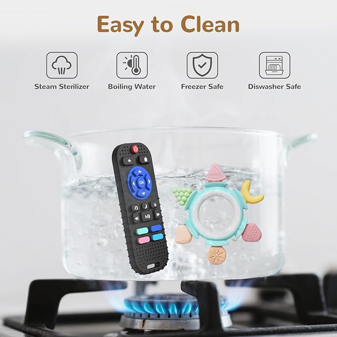- 【Easy to Clean】Hooku Infant Teething toys for babies 6-12 months No Deformation, No Fading, More Assured of Biting. The Remote Control Teether for Baby can be used in dishwashers, refrigerators, also freezable. Recommended that you wash it and boil it for sterilization before use.