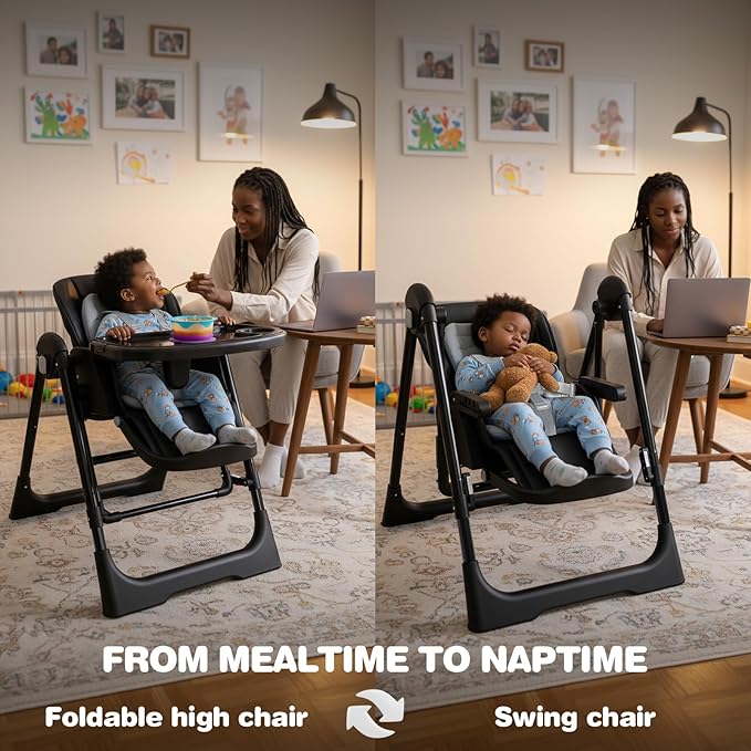 High Chairs for Babies and Toddlers Foldable High Chair Adjustable with Reclining Seat & Leg Rest, 3-in-1 Convertible Baby Swings with Tool-Free Assembly (Black)
