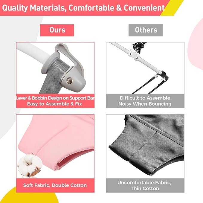 - 【Better Material, Soft & Comfortable】Safety is very important when children play, that's why we strive to make our products safer! Our baby jumpers are equipped with 304 stainless steel springs, which are strong and flexible. Two buckles and adjustable seat belts ensure your baby's safety. Made of soft cotton, it's comfortable for your elder kids to play, while liberating parents' hands.