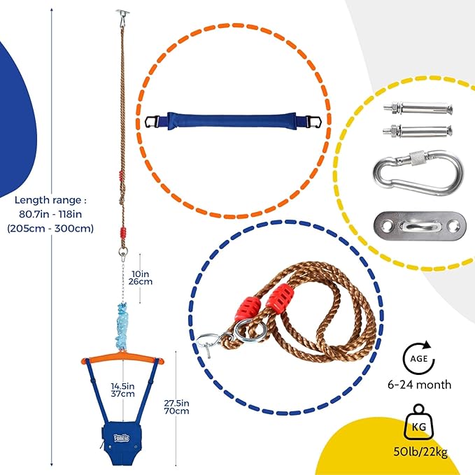 - 【What You Will Get】Package includes: 1*FUNLIO baby jumper, 1*stainless steel ceiling hook,1*toddler leash, 2*expansion bolts, 1*safety extension rope. The ceiling hook is made of high-quality stainless steel, strong and durable. The expansion bolts are sturdy and easy to set. The safety extension rope is adjustable (29.5in - 61in), so you can easily adjust it to an ideal length. Everything you need is prepared in this convenient set.