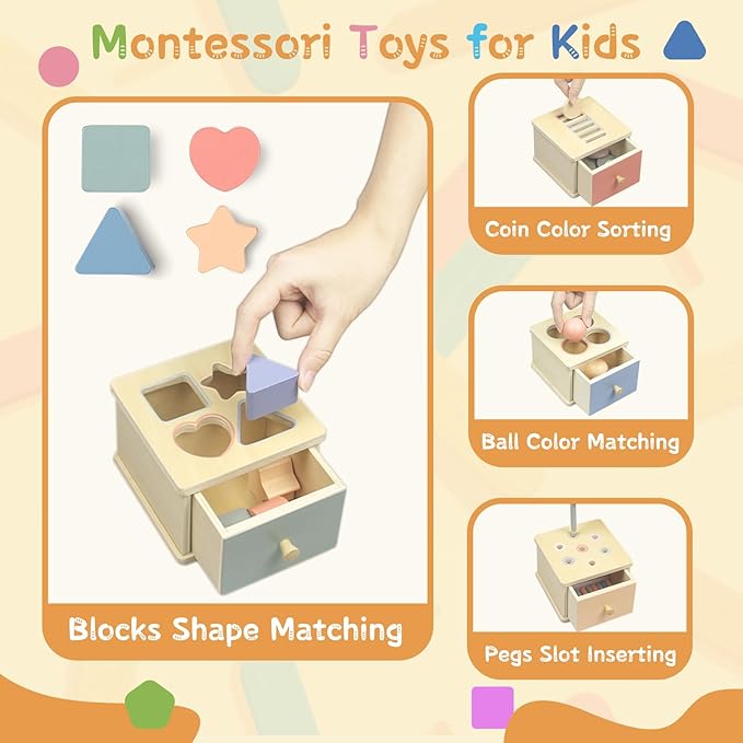 Montessori Toys for 2 3 4 5 Year Old - Wooden Object Permanence Box with Drawer Sensory Toys Shape Sorter Color Sorting Education for Baby Toddler Boy Girl Drop Busy Box (B-Blocks)