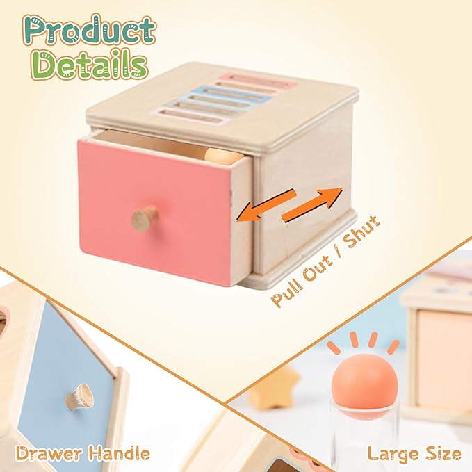 Montessori Toys for 2 3 4 5 Year Old - Wooden Object Permanence Box with Drawer Sensory Toys Shape Sorter Color Sorting Education for Baby Toddler Boy Girl Drop Busy Box (D-Coins)