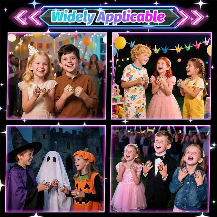 - [High-Quality Goodie Bag Essentials] Crafted with durable plastic, long‐lasting LEDs, and an adjustable ring design to fit both kids and adults. Even with batteries drained, these rings function as satisfying fidget spinners. A must-have for party bags, carnival prizes, and summer camp giveaways—guaranteed to light up any event!