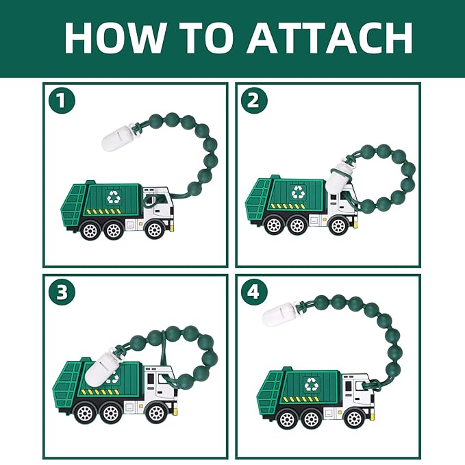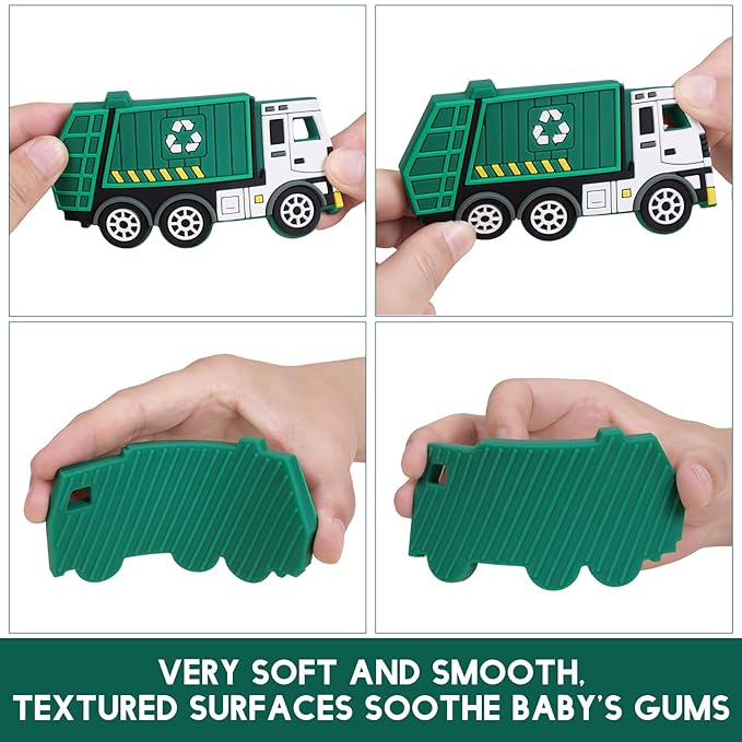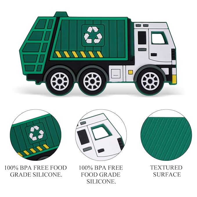 Baby Food Grade Silicone Carrier Vehicle Teether Toy with Pacifier Clip Holder,Teething Toys Gift Set for 3 Months+ Boys and Girls,Freezer Safe,BPA Free.(Garbage Truck)