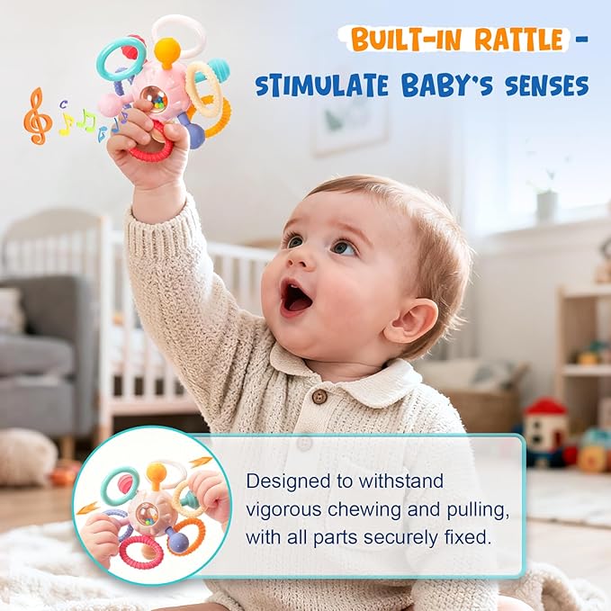 - Multi-Sensory Baby Toy: Features textured silicone balls and rings with bright colors and rattle sounds, designed to engage your baby’s touch, sight, and hearing. Promotes sensory development while providing hours of fun and interactive play.