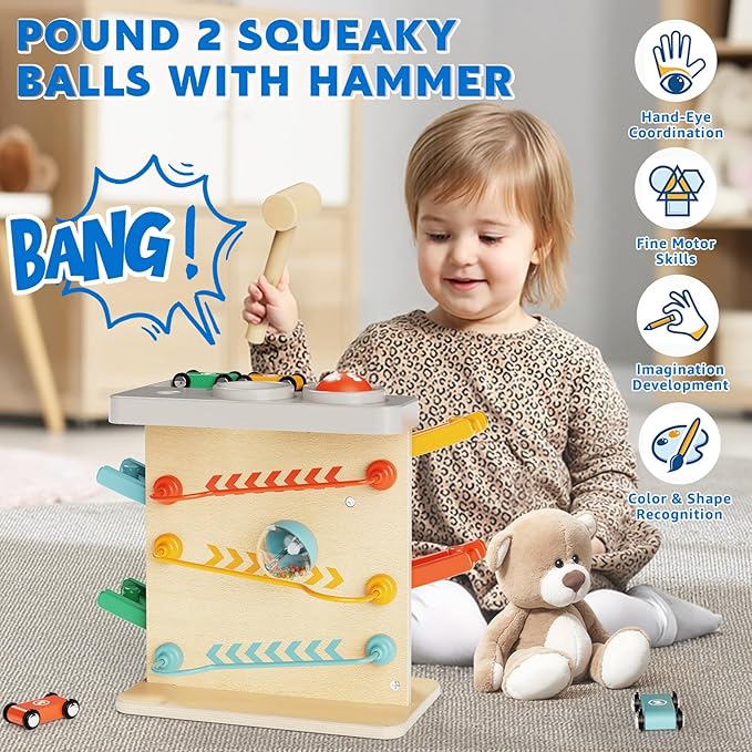 - ๐[BALL DROP & RACE TRACK FOR ENDLESS ENTERTAINMENT] - Double the joy in our 2-in-1 activity toy! Your baby will love the challenge of pounding the balls with the included hammer, watching and hearing them clatter down. Flip it over for an exciting rainbow racing! Watch your toddlerโs eyes light up as they hammer balls down the layers and race cars down the tracks. Our educational toy is the perfect choice to nurture your childโs curiosity and provide diverse entertainment. It's a standout choice for parents seeking both fun and educational value in a single, durable toy.