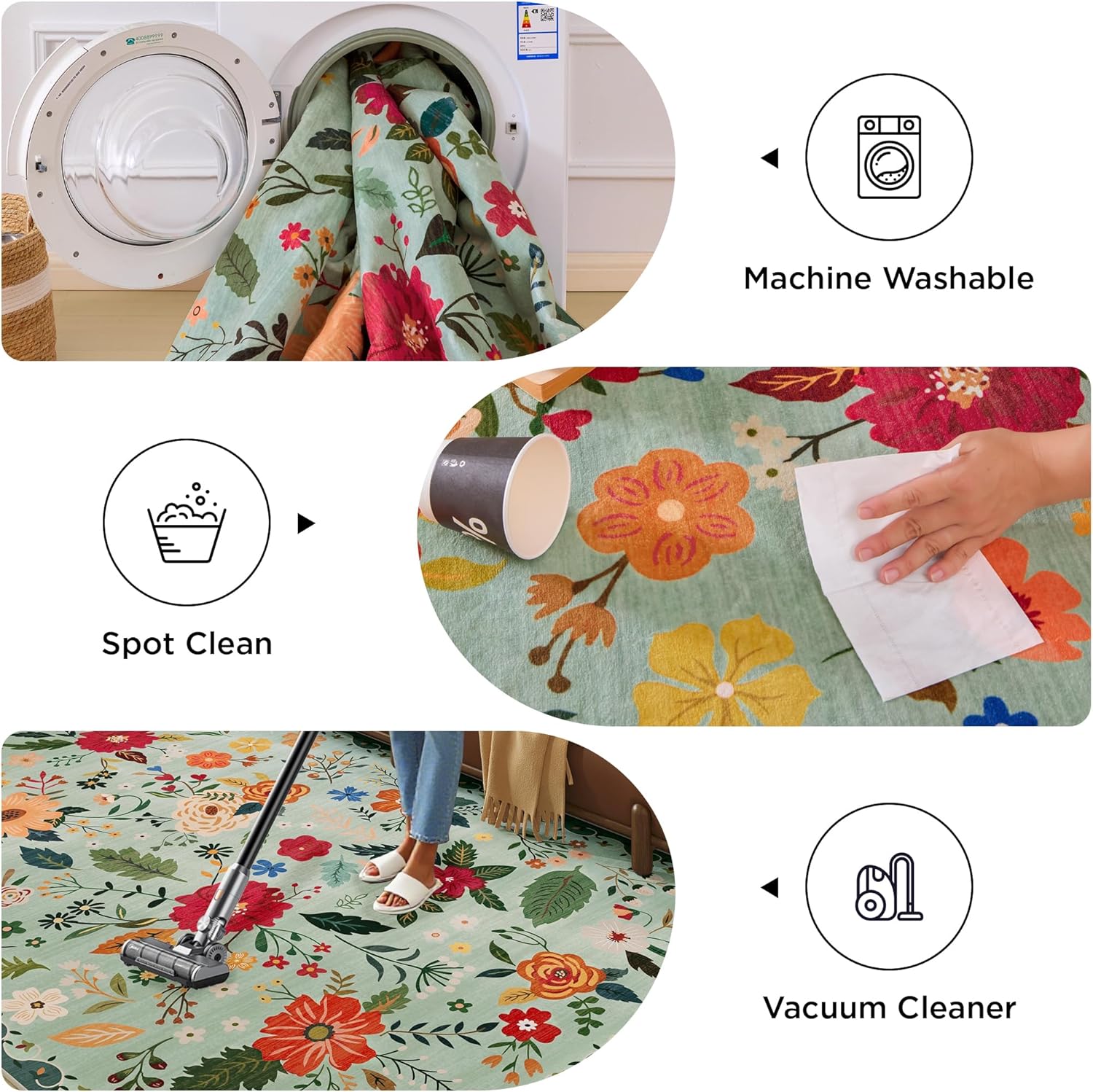 - WASHABLE RUG: Designed for easy care, this rug features a stain- and water-resistant surface that makes cleanup simple – just wipe, vacuum, or sweep as needed. For tougher stains, this carpet is machine-washable (cold water, gentle cycle) with no color fading. Avoid bleach. After washing, air-dry or tumble dry on no-heat setting to preserve quality.