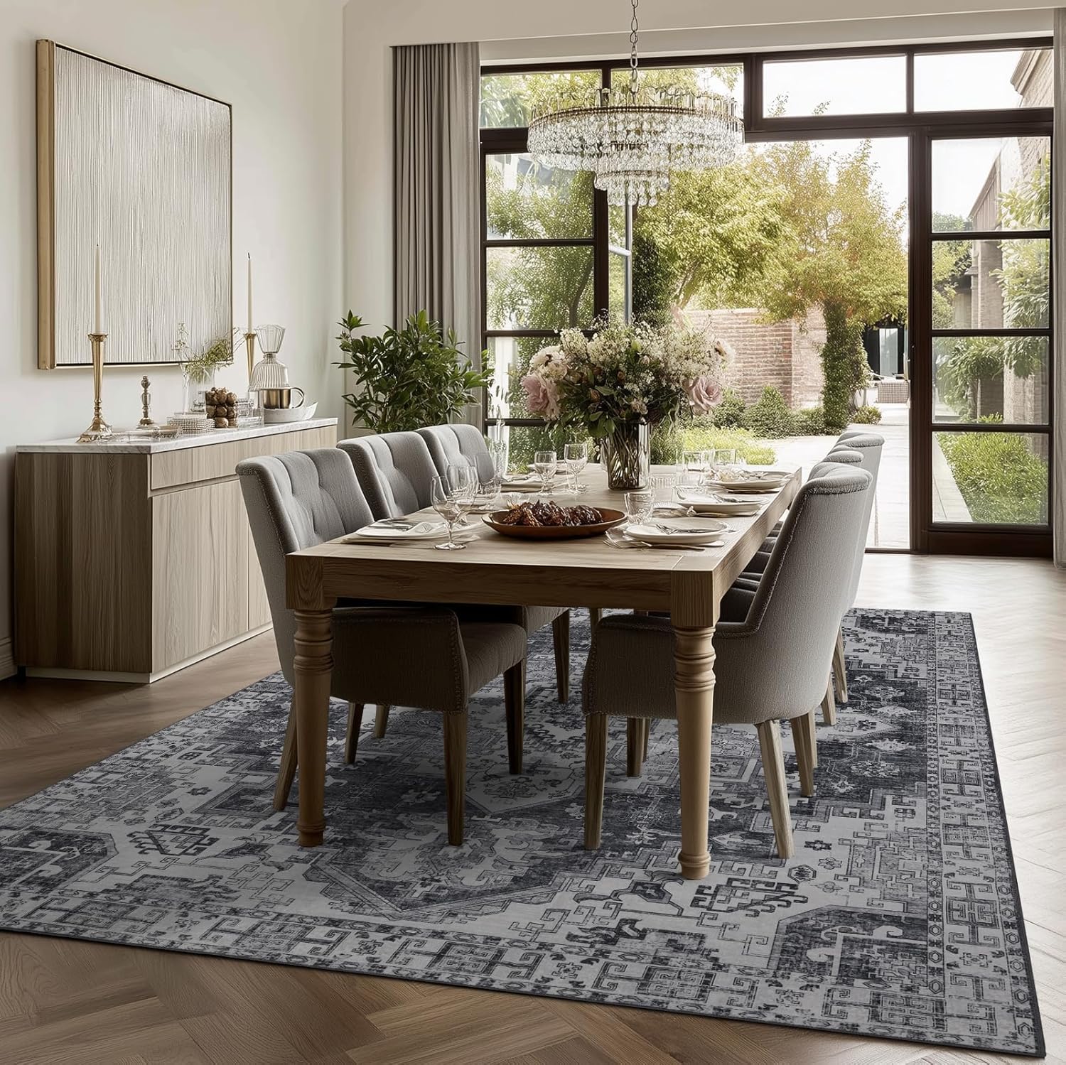 4x6 Washable Area Rug for Living Room, Carpet for Bedroom, Soft Faux Wool Retro Dining Room Rug, Non Slip&Non-Shedding Resistant Low Pile Vintage Print Rug for Home Office (Medium Gray)