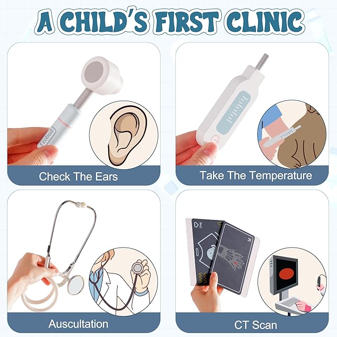 - 【Essential Vet Tools for Pretend Play】 Our kids doctor set packs essentials: syringe, otoscope, thermometer, medicine bottles, pills, patient chart, stethoscope, and CT scan card for immersive diagnostic adventures.
