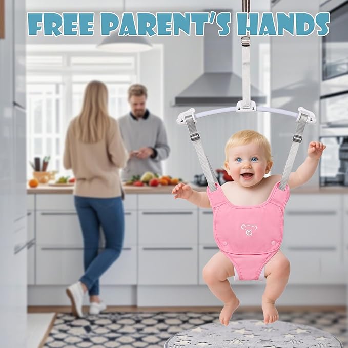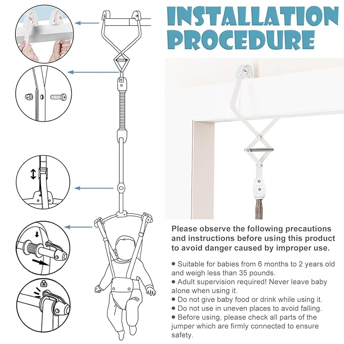 - Easy Assembly and Portability: Lightweight and compact, designed for busy parents, our portable baby jumper for baby is easy to assemble and disassemble, making it perfect for travel and storage, you need is a suitable doorframe, and your baby can play safely within the room