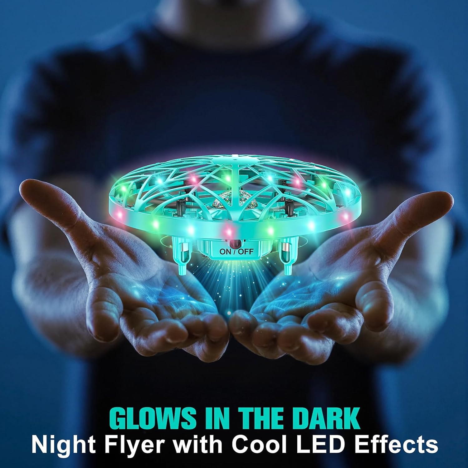 - 360° Rotating Flight Design: Fly this mini UFO drone toy with your hands! Place both hands on both sides of the drone, swipe a hand under when the lights start to blink rapidly, and watch this LED drone perform a 360° flip