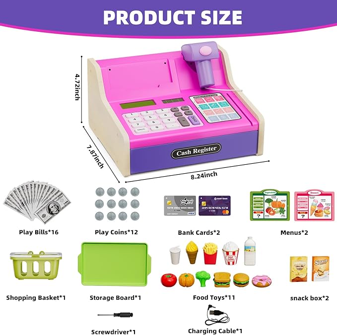 - 【Rechargeable & Educational Toy】 Equipped with a built-in rechargeable battery, this kids cash register supports up to 10 hours of uninterrupted imaginative play. Watch as your child explores the fun of real-world shopping: they can pick the basket, select their favorite food toys, and bring them to the checkout. Then cashier uses the calculator to add up the total, while the customer hands over the play money to complete the purchase. By blending play with practical learning, this toy becomes an ideal educational tool for growing minds.