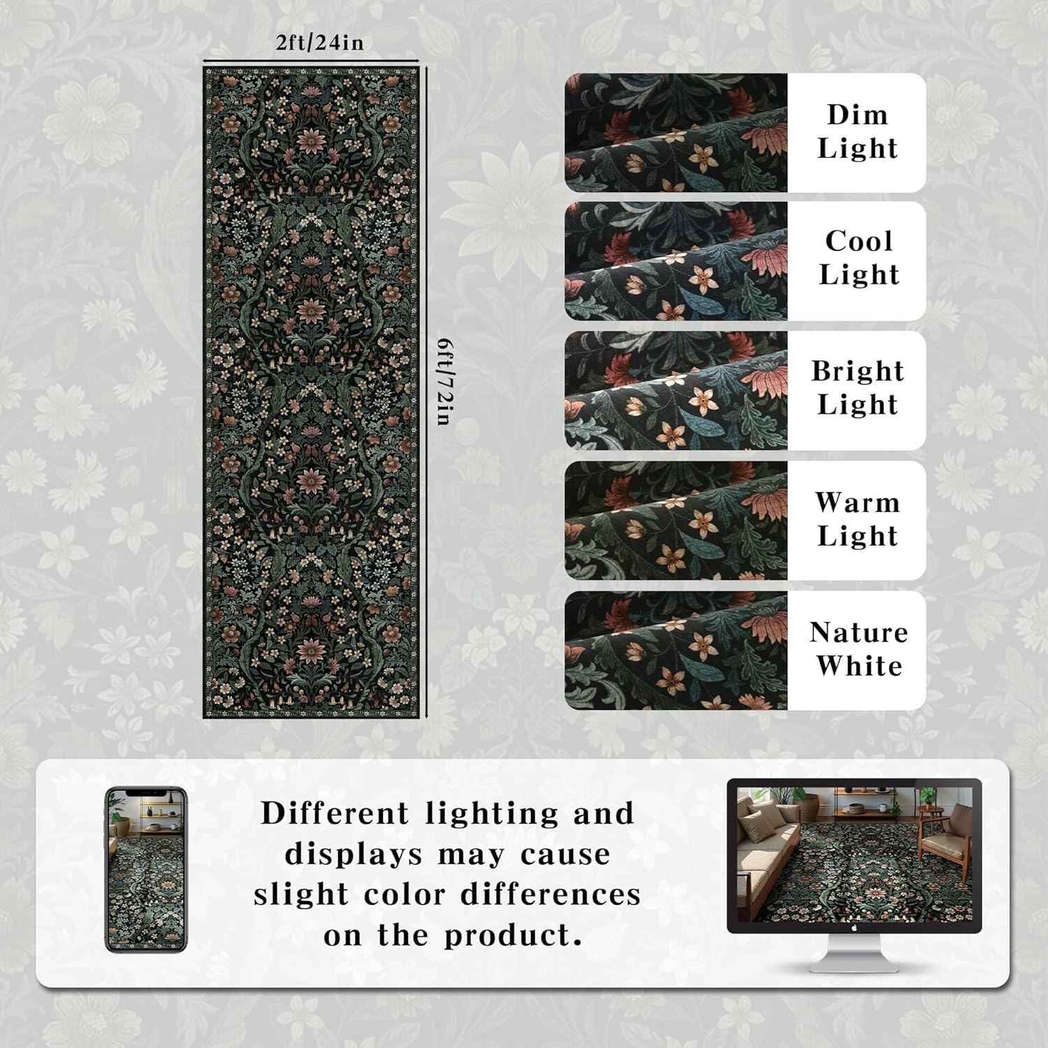 - Botanical Floral Rug: Intricate garden motifs of this 2x6 runner rug create natural elegance that harmonizes with both classic and modern interiors. It's ideal for living room, bedrooms, dining room, kids' playrooms or home office, injecting vibrancy and freshness into your space.