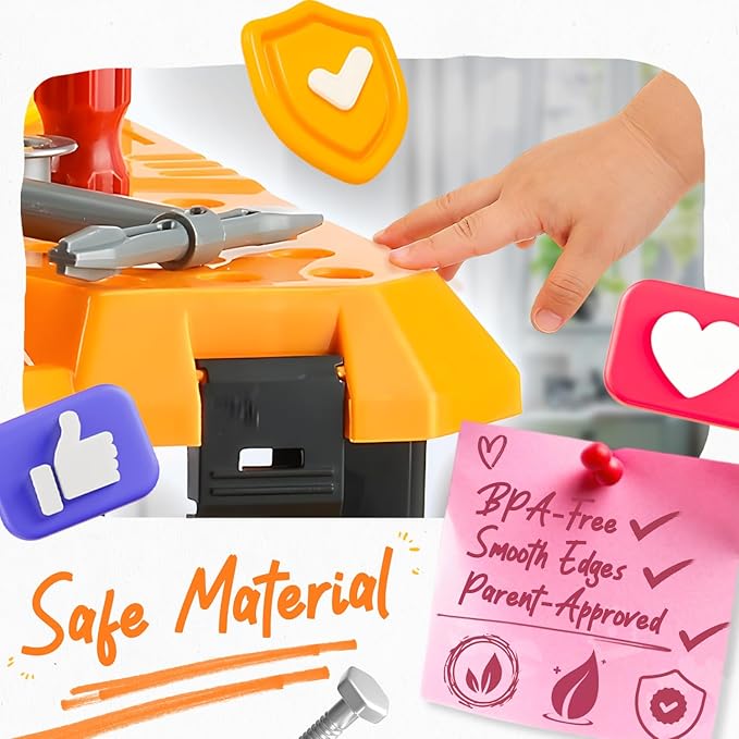 - Safe & Sturdy Toddler Tool Bench for Endless Play: Crafted from non-toxic, durable plastic with smooth edges, this toddler tool set meets strict safety standards—great for a tool bench for toddlers 1-3. The robust construction of this kids workbench ensures it withstands energetic play, while the kid-friendly design prevents scratches, making it a reliable choice for parents seeking a long-lasting toy workbench