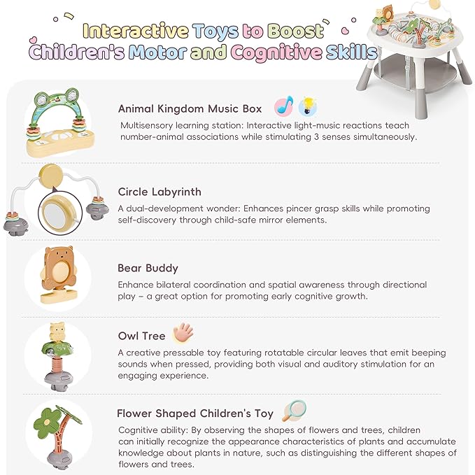 - SWIVEL SEAT & 5 INTERACTIVE TOYS: Children can sit on the 360° rotatable seat to explore the world around them. The owl, circle labyrinth, bear, and flower shaped toy keep your child excited and entertained. Plus, the animal music box also has 10 songs & 7 colors (3 AA batteries required (not included))
