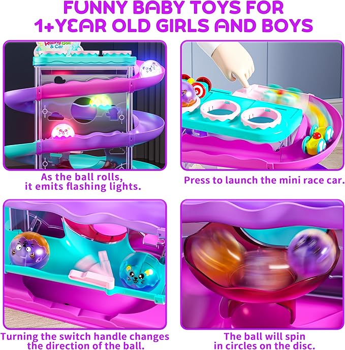 • MULTIPLE WAYS TO PLAY - Designed with 3 layers of tracks in different colors, with 3 light-up balls & 3 mini racing cars, they start from the top, allowing children to have fun watching the balls and cars speeding on the track. This toy perfectly combines fun and must-have toys for young children to learn.