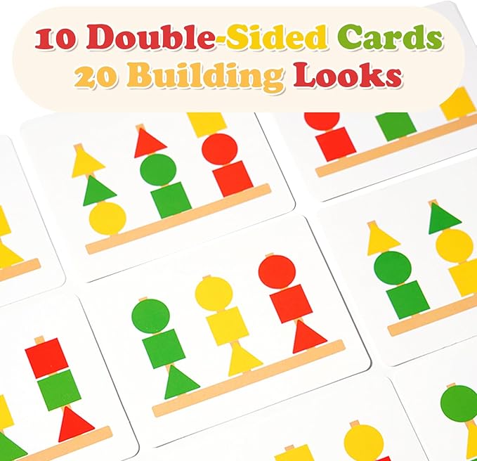 - 【Versatile Play Modes】:This set includes red, yellow, and green wooden blocks in cube, triangle, and circle shapes, accompanied by a wooden base and ten double-sided shape cards. It supports diverse gameplay—sort by shape/color, build 3D structures, create patterns, or build from cards. The interactive design encourages independent exploration and social play, keeping toddlers focused in a screen-free environment.