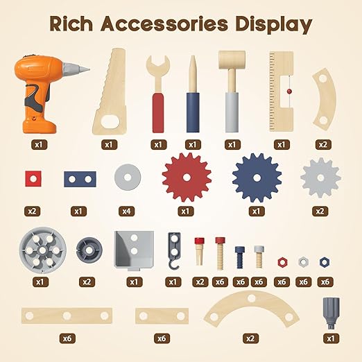 - A Wonderful Gift For Childs : The wooden kids tool bench set empowers kids to role-play as builders and creators, transforming imaginative ideas into tangible creations.This hands-on play provides lasting value, making it a truly rewarding present for any curious child