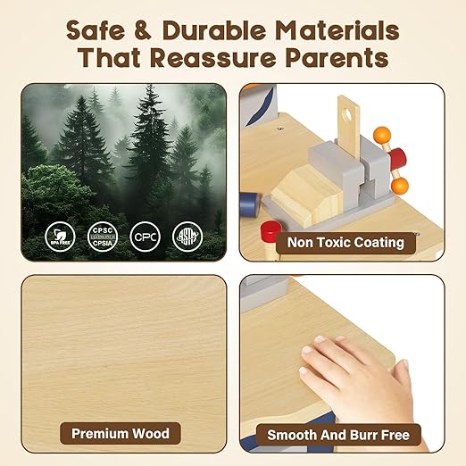 - Certified Safe & Durable Construction : The toddler tool bench is crafted from high-quality wood with smooth, rounded edges and non-toxic paint. It is certified to meet international safety standards (CE, ASTM, CPC) for your complete peace of mind