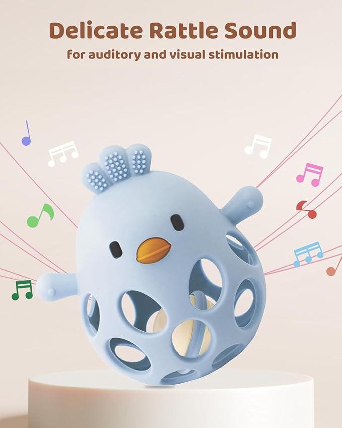 - 【2-in-1 Teething & Rattle Toy】This innovative teething toy set includes an easy-to-grasp teether and a rattle ball. The chick-shaped teether features extra grip holes, making it easier for babies to hold. The built-in rattle encourages babies to grasp, shake, and play, helping to develop hand-eye coordination and enhance sensory awareness.