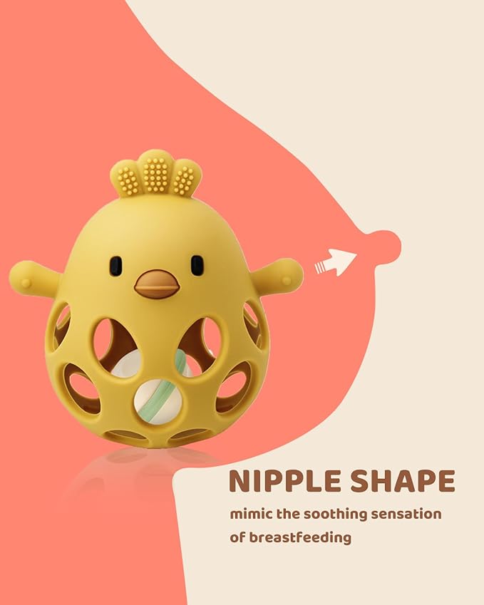 - 【2-in-1 Teething & Rattle Toy】This innovative teething toy set includes an easy-to-grasp teether and a rattle ball. The chick-shaped teether features extra grip holes, making it easier for babies to hold. The built-in rattle encourages babies to grasp, shake, and play, helping to develop hand-eye coordination and enhance sensory awareness.
